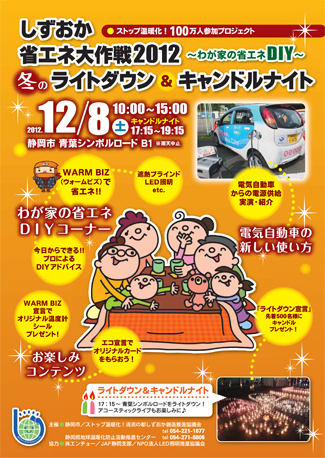 12/08(土) ライトダウン&キャンドルナイト 時間:17:15〜19:15 場所:静岡市 青葉シンボルロードB1ブロック 内容:青葉シンボルロードを一斉にライトダウン! きれいに輝くキャンドルの灯りを見ながらアコースティックライブをぜひ! ライトダウン宣言をした先着500名様にキャンドルをプレゼント! ※雨天中止 ※主催:静岡市/ストップ温暖化!清流の都しずおか創造推進協議会 静岡県地球温暖化防止活動推進センター ※協力:株式会社エンチョー/JAF静岡支部/NPO法人照明推進協議会 チラシはこちら ⇒ ホームページはこちら ◎アース・キッズ キックオフを開催します! ・12/06(木) 浜松市立広沢小学校(5年生 166名) ◎アース・キッズ セレモニーを開催します! ・12/04(火) 熱海市立第二小学校(5年生 59名) ・12/05(水) 富士宮市立富士見小学校(4年生 114名) ・12/07(金) 沼津市立第四小学校(5年生 103名) |