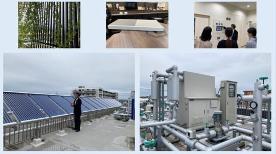 屋上のヒートポンプチラーでは、井戸水を利用し冷温水が作られ、冷暖房パネルの熱源となるそうです。非常時には、この井戸水(10トン!)は飲み水になり、会議室は避難所になることも想定されています。環境への配慮と、地域のつながりを大切にしている姿勢が印象的でした。