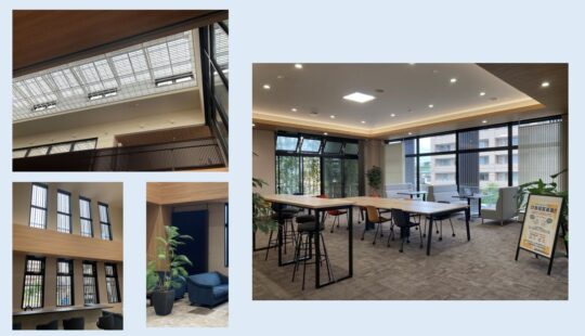 実際にオフィスでもある、こちらのZEB建物(Net Zero Energy Building)は、どこにいても自然の光が明るく、やさしい雰囲気。空調機を使わず、熱対流を利用し自然の風がうまく抜けるようになっています。